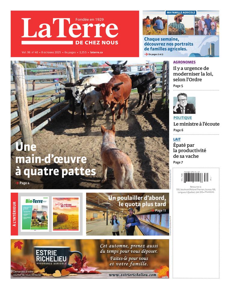 SAINT-CYRILLE-DE-WENDOVER – Rassemblés devant un enclos de la Ferme Simpson, le 19 octobre, dans le Centre-du-Québec, une trentaine de producteurs agricoles observent un chien de race border collie...